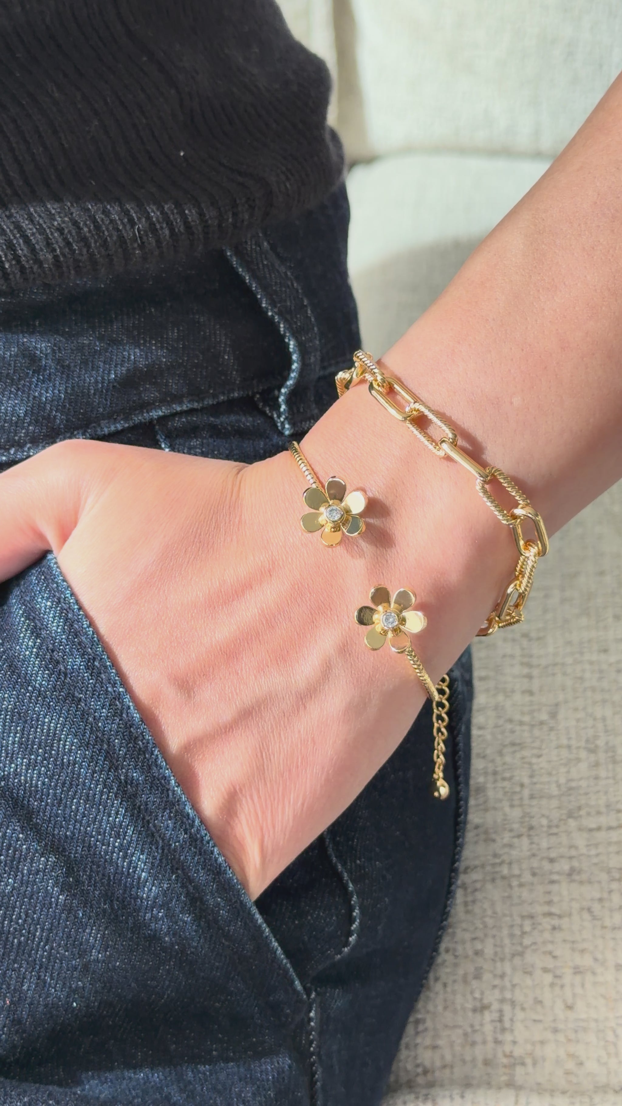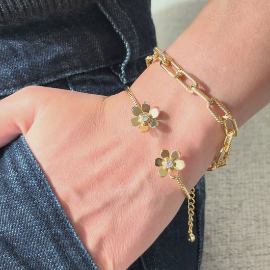 A delicate open cuff featuring two golden flower ends with subtle shine. Simple, feminine, and perfect for adding a soft touch of elegance to any look.