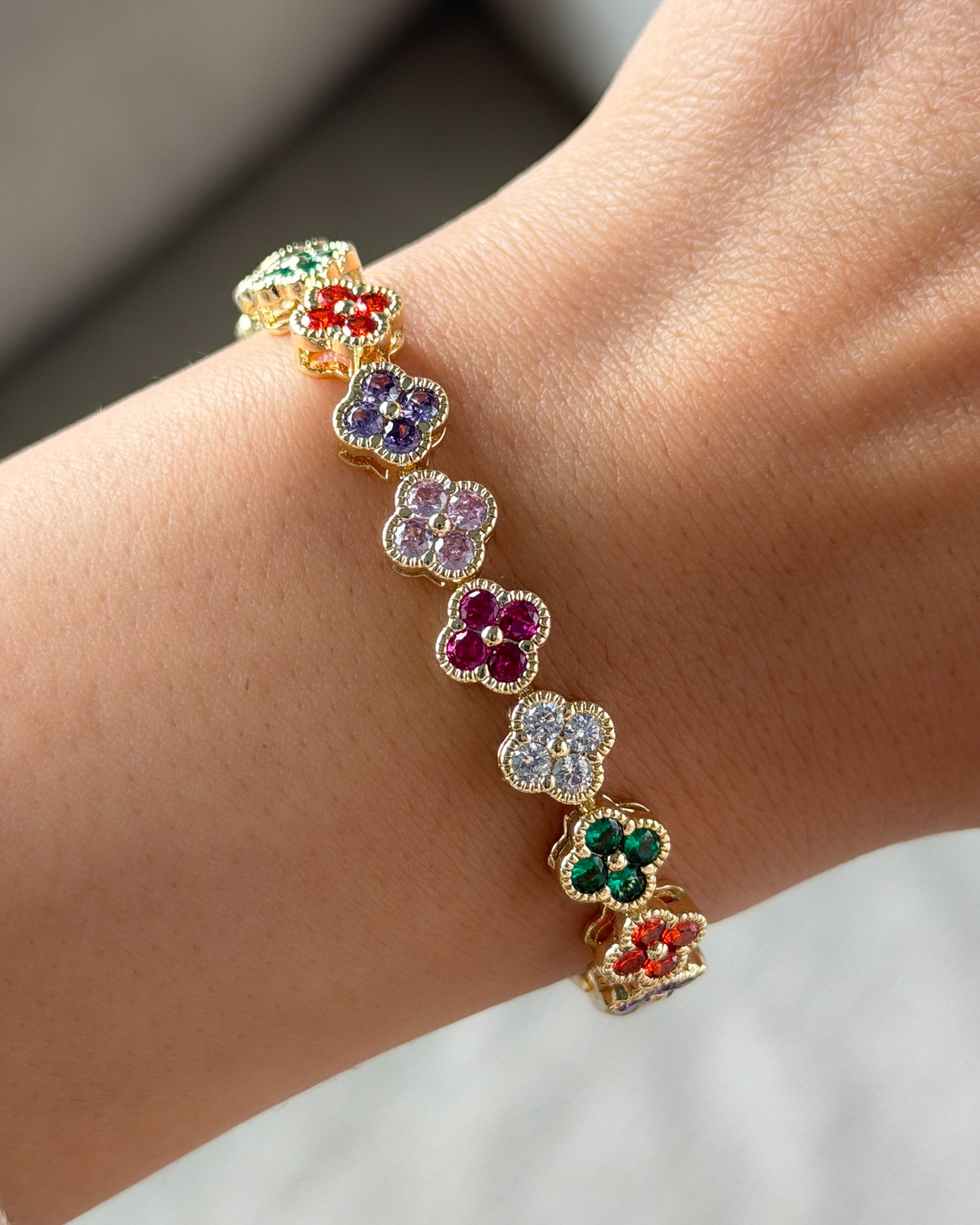 A vibrant floral-inspired bracelet featuring multi-color stones set in delicate petal motifs. Eye-catching, playful, and perfect for adding a pop of color to any stack.