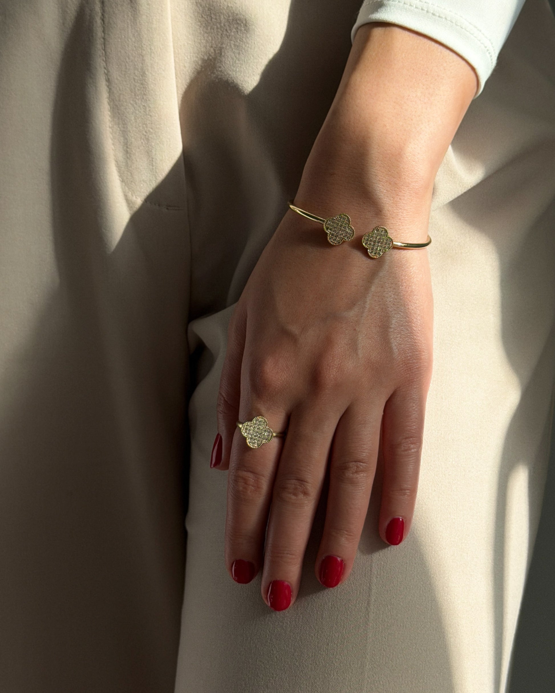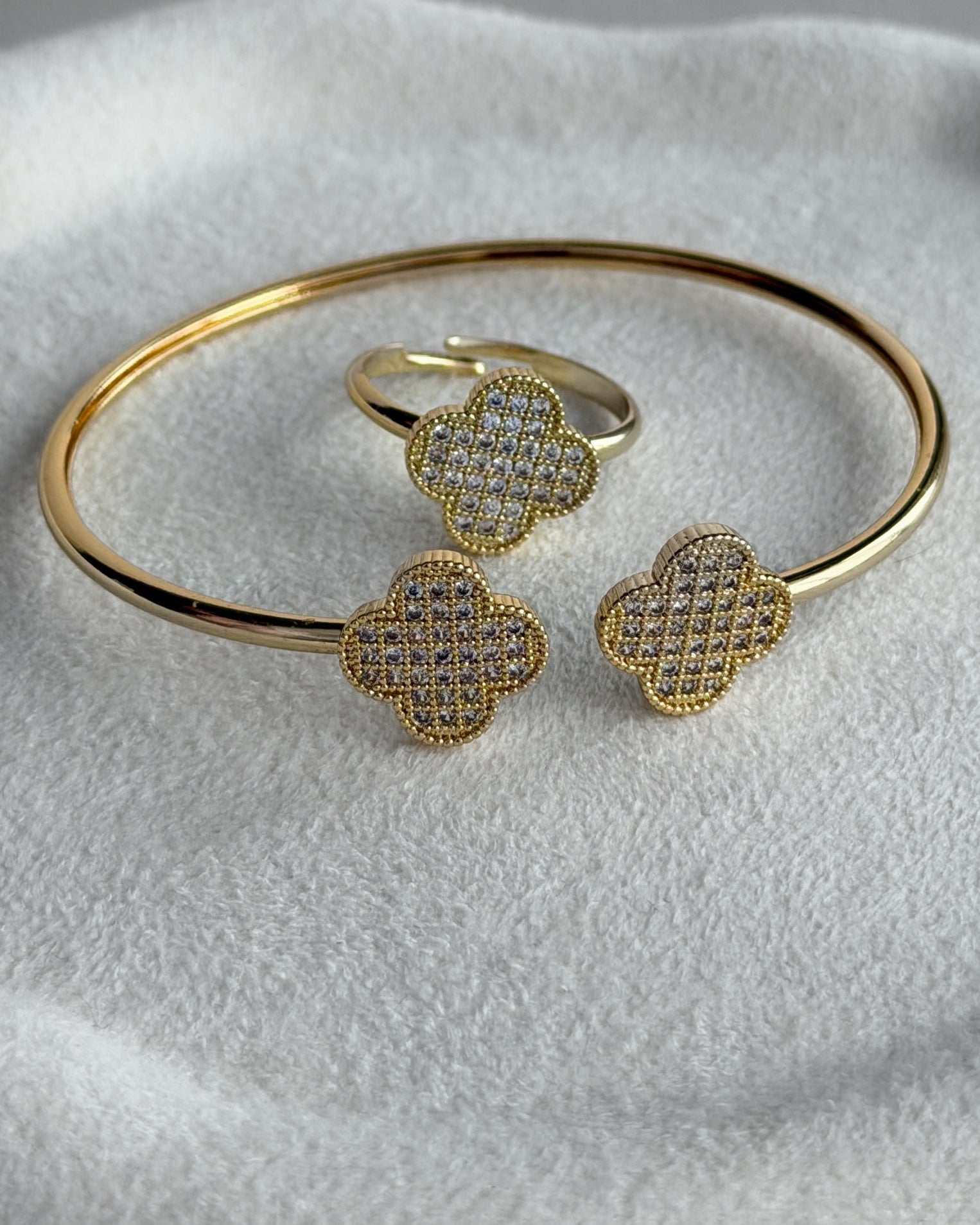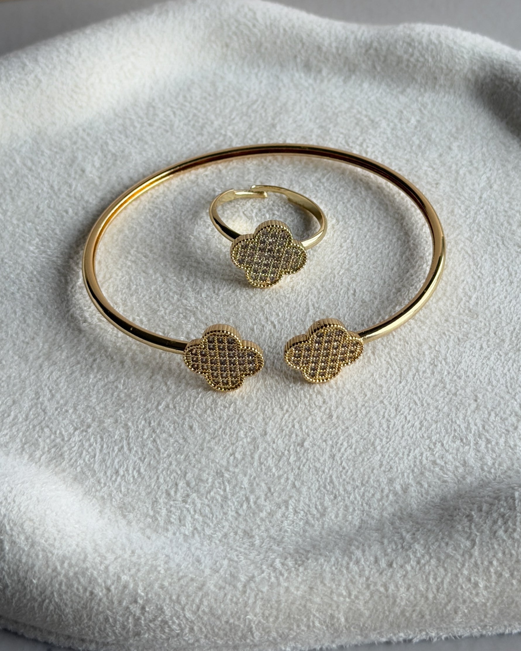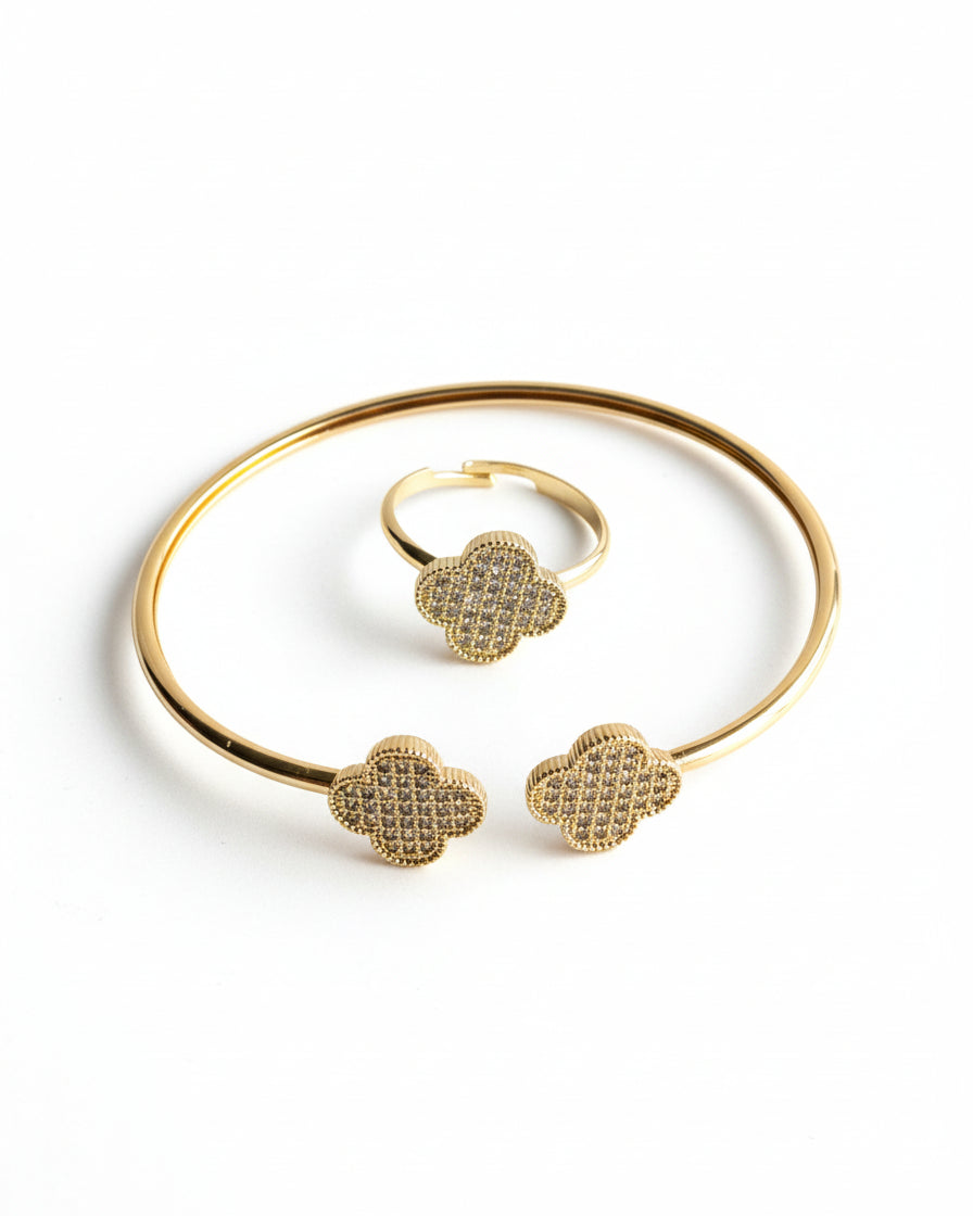An elegant gold-tone bracelet and ring set adorned with shimmering stones that catch every light. Designed for versatility, both pieces are adjustable for a perfect fit. the ideal match of modern sparkle and timeless elegance.